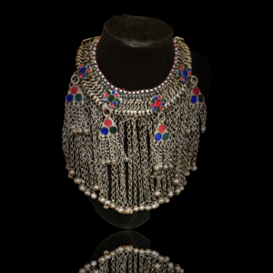 Afghani Vintage Tribal Choker – Handmade Statement Necklace with Colorful Glass & Chain Fringe